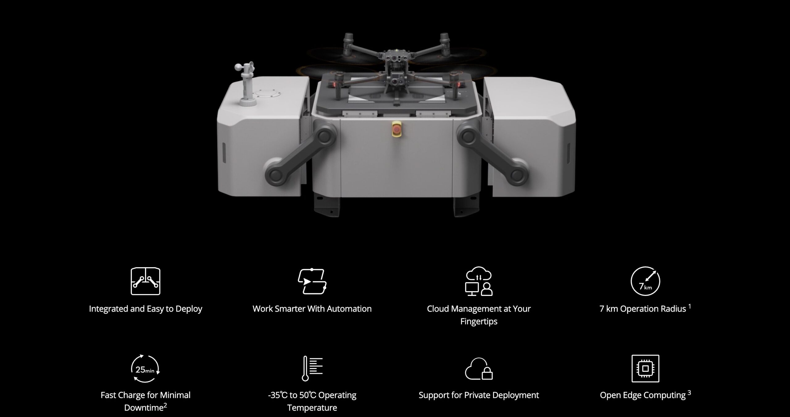 DJI Dock on vastupidav, töökindel ja loodud töötama 24/7, päeval või öösel, vihma või palava päikesega.